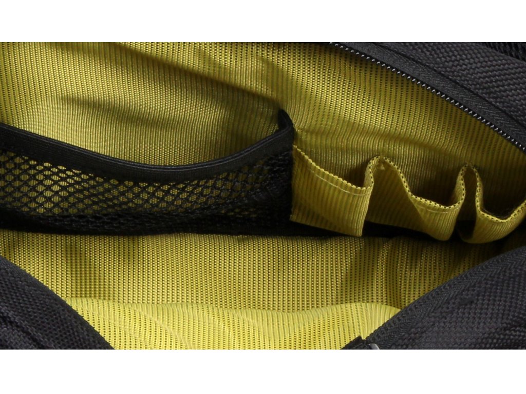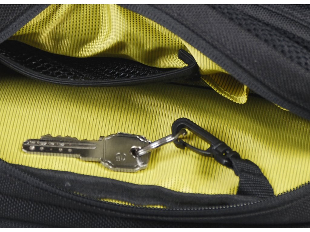 - Hlavní kapsa: háček na klíče, tři držáky pro pera a síťovaná kapsa s elastickým lemem.